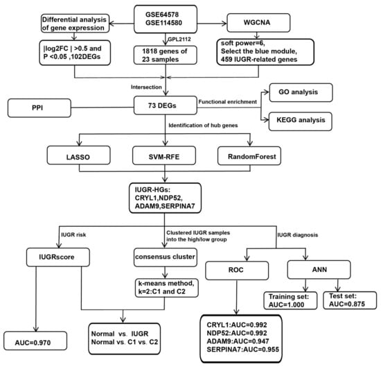 We further investigated whether the selected IUGR-HGs were valuable for the diagnosis of IUGR in sheep. The performance of these genes was evaluated in the combined dataset using ROC curves. Specifically, we obtained hub gene expression data and disease status grouping data from samples of sheep with IUGR, performed ROC analysis using the “roc” function of the “pROC” package [37], and obtained the final area under the curve (AUC) results using the “ci” function. Figure 1 shows the complete workflow of this study.