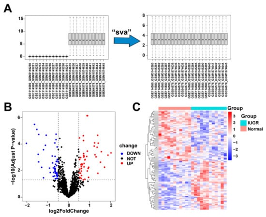 Data correction and screening of differentially expressed related genes in IUGR. (A) The overall landscape of data features before and after data merging. (B) Volcano plot showing the differentially expressed genes (DEGs) in the samples; red represents upregulation and blue represents downregulation. (C) Heatmap showing the overall landscape of the 102 DEGs between the normal and IUGR samples.