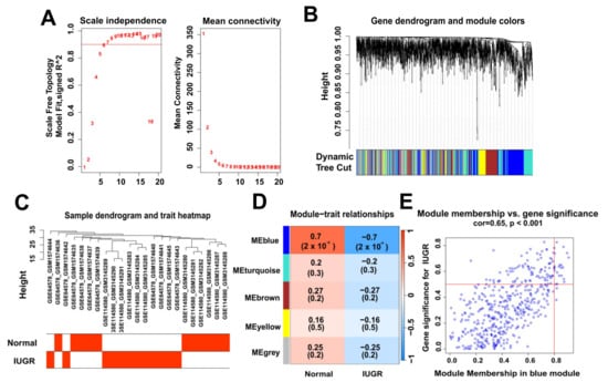 Identification of modular genes associated with IUGR by WGCNA. (A) Graphs of the soft-threshold power versus scale-free topology model fit index and mean connectivity. Six was chosen as the appropriate soft power. (B) Dendrogram of the genes clustered on the basis of a dissimilarity measure. (C) Dendrogram of samples and a heatmap plot of the indicated traits. (D,E) Analysis of relationships among gene modules and different traits; the blue module shows the most IUGR trait-specific modules in the samples.
