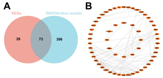 Screening of core differential genes in IUGR and its PPI network. (A) Venn plot showing the intersection of DEGs with blue module genes. (B) PPI network showing the interaction between 73 IUGR-related DEGs.