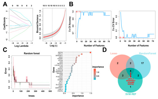 We used three machine learning algorithms to identify the hub genes: support vector machine recursive feature elimination (SVM-RFE), random forest (RF), and least absolute shrinkage and selection operator (LASSO). SVM-RFE is a sequential backward selection algorithm based on the maximum-margin principle. The optimal solution is filtered by sorting the scores of each feature using the model training samples [25]. RF integrates multiple trees through ensemble learning; its basic unit is a decision tree, which belongs to the category of ensemble learning in machine learning [26]. LASSO is a linear regression method that uses L1 regularization to make some of the learned feature weights zero, thereby achieving sparsity and feature selection [27]. First, we used the SVM-RFE algorithm from the “e1071” package [28], the RF algorithm from the “randomForest” package [29], and the LASSO algorithm of “glmnet” package [30] to analyze 73 IUGR-related DEGs and identify potential candidate genes. We then intersected the candidate genes screened by the above three algorithms using Venn diagrams and identified four intersected hub genes (IUGR-HGs).