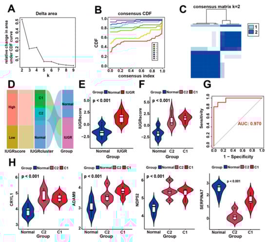 Construction of IUGR scoring system and identification of IUGR grouping subtypes. (A–C) Consensus clustering of sheep samples with IUGR, k = 2. (D) Alluvial plot showing the IUGR score, IUGR cluster, and disease changes. (E) Violin plot showing the IUGR score between the normal and IUGR groups. (F) Violin plot showing the IUGR score among the normal, C1, and C2 groups. (G) ROC curve of the IUGR score. (H) Expression analysis of the four hub genes in the three subgroups.