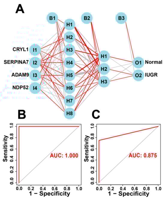 Construction of the ANN based on IUGR-HGs to diagnose normal and IUGR samples. (A) ANN construction process; (B) AUC of the training cohort with a value of 1; and (C) AUC of the test cohort with a value of 0.875.