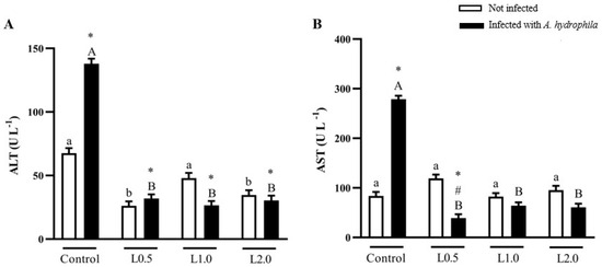 Figure 1. Liver transaminases, alanine (ALT) (A) and aspartate aminotransferase (AST) (B), activities in plasma of Rhamdia quelen fed different doses of R-(+)-limonene in the diet and infected or not with A. hydrophila. Data are presented as mean ± SEM (n = 8). Two-way ANOVA and Tukey’s test, p < 0.05. Different lowercase letters indicate significant differences between healthy groups. Different capital letters indicate a significant difference between groups infected with A. hydrophila. The number sign (#) indicates a significant difference between the groups infected with A. hydrophila in relation to the healthy groups. The asterisk (*) indicates a significant difference between the groups infected with A. hydrophila in relation to the respective healthy control group.
