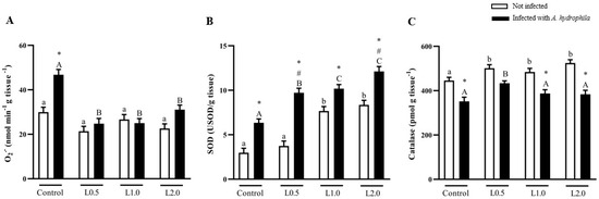 Figure 2. Superoxide (O2•−) levels (A) and superoxide dismutase (SOD) (B) and catalase (CAT) (C) activities in the liver of Rhamdia quelen fed different doses of R-(+)-limonene in the diet and infected or not with A. hydrophila. Data are presented as mean ± SEM (n = 8). Two-way ANOVA and Tukey’s test, p < 0.05. Different lowercase letters indicate significant differences between healthy groups. Different capital letters indicate a significant difference between groups infected with A. hydrophila. The number sign (#) indicates a significant difference between the groups infected with A. hydrophila in relation to the healthy groups. The asterisk (*) indicates a significant difference between the groups infected with A. hydrophila in relation to the respective healthy control group.