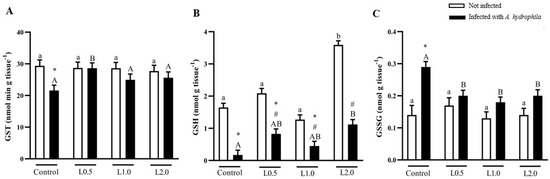 Figure 3. Glutathione S-transferase (GST) activity (A), reduced (GSH) (B), and oxidized glutathione (GSSG) (C) levels in the liver of Rhamdia quelen fed different doses of R-(+)-limonene in the diet and infected or not with A. hydrophila. Data are presented as mean ± SEM (n = 8). Two-way ANOVA and Tukey’s test, p < 0.05. Different lowercase letters indicate significant differences between healthy groups. Different capital letters indicate a significant difference between groups infected with A. hydrophila. The number sign (#) indicates a significant difference between the groups infected with A. hydrophila in relation to the healthy groups. The asterisk (*) indicates a significant difference between the groups infected with A. hydrophila in relation to the respective healthy control group.