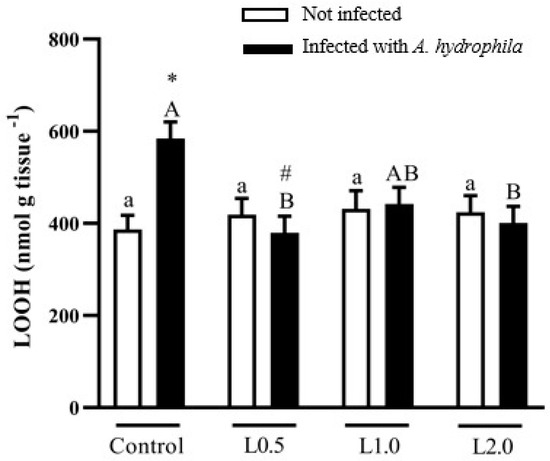 Figure 4. Lipid hydroperoxide levels in the liver of Rhamdia quelen fed different doses of R-(+)-limonene in the diet and infected or not with A. hydrophila. Data are presented as mean ± SEM (n = 8). Two-way ANOVA and Tukey’s test, p < 0.05. Different lowercase letters indicate significant differences between healthy groups. Different capital letters indicate a significant difference between groups infected with A. hydrophila. The number sign (#) indicates a significant difference between the groups infected with A. hydrophila in relation to the healthy groups. The asterisk (*) indicates a significant difference between the groups infected with A. hydrophila in relation to the respective healthy control group.