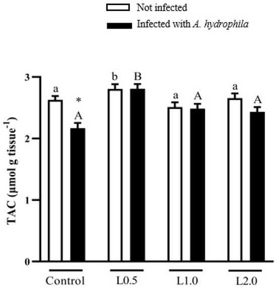 Figure 5. Total antioxidant capacity (TAC) in the liver of Rhamdia quelen fed with different doses of R-(+)-limonene in the diet and infected or not with A. hydrophila. Data are presented as mean ± SEM (n = 8). Two-way ANOVA and Tukey’s test, p < 0.05. Different lowercase letters indicate significant differences between healthy groups. Different capital letters indicate a significant difference between groups infected with A. hydrophila. The asterisk (*) indicates a significant difference between the groups infected with A. hydrophila in relation to the respective healthy control group.