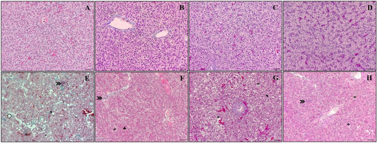 Figure 6. Effects of R-(+)-limonene supplemented in the diet on histopathological findings observed in the liver of Rhamdia quelen infected or not with A. hydrophila. Representative images of Masson-Goldner trichrome histological staining in the liver tissue of silver catfish exposed to R-(+)-limomene. Control (A), L0.5 (B), L1.0 (C), L2.0 (D), without A. hydrophila; control (E), L0.5 (F), L1.0 (G), L2.0 (H), with A. hydrophila. (n = 8). 200× (bar = 20 µm). + (vacuolation of hepatocytes), Animals 13 03307 i001 (infiltration of erythrocytes into the blood sinusoids), Animals 13 03307 i002 (nuclear pyknosis), Animals 13 03307 i003 (hemorrhage), Animals 13 03307 i004 (fibrosis), Animals 13 03307 i005 (binucleated hepatocytes).
