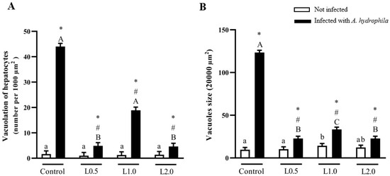 Figure 7. Quantitative (A) and morphometric (B) analysis of vacuoles in hepatocytes in the liver of Rhamdia quelen fed different doses of R-(+)-limonene in the diet and infected or not with A. hydrophila. Data are presented as mean ± SEM (n = 8). Two-way ANOVA and Tukey’s test, p < 0.05. Different lowercase letters indicate significant differences between healthy groups. Different capital letters indicate significant differences between groups infected with A. hydrophila. The number sign (#) indicates a significant difference between the groups infected with A. hydrophila in relation to the healthy groups. The asterisk (*) indicates a significant difference between the groups infected with A. hydrophila in relation to the respective healthy control group.