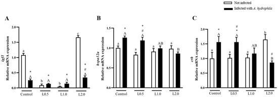 Figure 8. Gene expression of igf1 in the liver (A), and hsp12a (B) and crh (C) in the brain of Rhamdia quelen fed different doses of R-(+)-limonene in the diet and infected or not with A. hydrophila. Data are presented as mean ± SEM (n = 8). Two-way ANOVA and Tukey’s test, p < 0.05. Different lowercase letters indicate significant differences between healthy groups. Different capital letters indicate a significant difference between groups infected with A. hydrophila. The number sign (#) indicates a significant difference between the groups infected with A. hydrophila in relation to the healthy groups. The asterisk (*) indicates a significant difference between the groups infected with A. hydrophila in relation to the respective healthy control group.