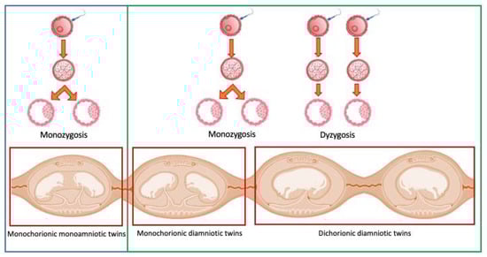 Focusing on twins, a clarification of the terms is necessary. Twin pregnancies are classified according to the type of conception (zygosity), the type of placentation (chorionicity), and the number of amniotic sacs (amnioticity) (Figure 1).