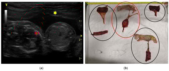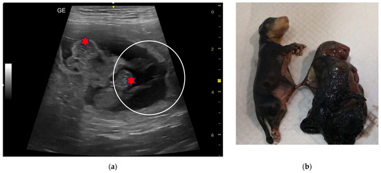 Twins in an Australian Shepherd dog: (a) The ultrasound image (micro-convex probe 12 MHz) shows two foetuses, with two distinct heads (red stars), scanned in the same gestational sac, with two umbilical cords (circle). The estimated gestational age at the time of this assessment is 30 days. (b) Twins of the opposite sex delivered already dead at the time of C-section. Death probably occurred at different times.