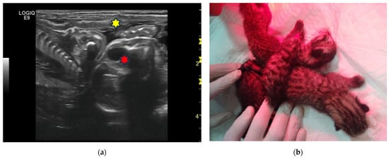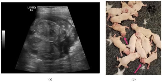 The last case concerns a 3-year-old Golden Retriever female dog, weighing 32 kg, inseminated via endoscopic transcervical intrauterine artificial insemination with fresh semen, which was diagnosed pregnant at 50 days, with an estimated numerosity by x-ray of 14 foetuses. One couple of twins was found using ultrasound (Figure 7a). An elective C-section was proposed and performed. The twins were delivered alive and were of opposite sex. When compared to their littermates they appeared slightly reduced in size, with areas without hair, and with deep pink discoloured skin on the head and limbs, indicative of a certain degree of dysmaturity (Figure 7b). Subsequently, the twins recovered, and their hair and weight were comparable to their brothers at weaning.