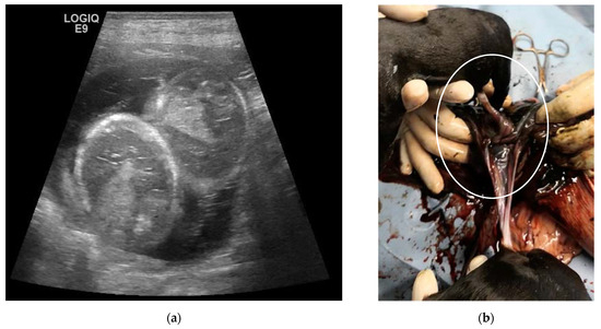 The fifth case is a 3-year-old Australian Shepherd female dog, artificially inseminated with fresh semen and diagnosed as pregnant at 23 days. Twelve embryos were counted, including a couple within the same gestational sac (Figure 5a). As in the previous cases, the embryos showed no signs of distress and had similar anatomical development. After routine monitoring, the date of delivery was scheduled, and a C-section proposed. The owner initially opted for a natural delivery, but the presence of green–brown discharge during the first phases of labour suggested the necessity of an emergency C-section. Ten alive and viable puppies were delivered. The twins were found almost engaged in the birth canal, probably causing an obstructive dystocia. They were of the opposite sex and died at different times, as one was found with the amniotic sac dry and attached to the body (Figure 5b). When compared to their littermates, they appeared slightly reduced in size.