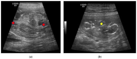 In veterinary medicine, prenatal diagnostic techniques are not yet as developed: essentially, they are limited to the evaluation of the mother’s health, the viability and the number of embryos/foetuses, and the estimation of the gestational age. Among imaging techniques, X-ray is still an elective technique in the estimation of litter size and is also able to diagnose foetal death by highlighting abnormal foetal bone displacement and/or gas in or around the foetuses [3,4,5]. Ultrasonography is the diagnostic modality of choice for diagnosing pregnancy, assessing foetal viability, and predicting the day of delivery, as well as for all the morphological evaluations of the foetus, including sexing [6,7,8,9,10]. Increasing attention has been paid to the ultrasound evaluation of the early diagnosis of anomalies. Normal foetal development can be assessed by observing the chronologic relationship between organ development and gestation, which is also useful for determining the date of delivery [10,11,12,13,14,15,16], and embryonic/foetal disorders can be predicted by observing a delay in the time of development of the organs or alterations in their appearance, or by finding a slow rate of foetal growth [17,18,19]. Single reports of foetal abnormalities diagnosed early using ultrasound have been reported, both in canine and feline species, including monochorionic twins [20,21], hydrops fetalis [22,23,24,25,26,27,28], hydrocephalus [29,30], clefts [31], and kidney defects [32].