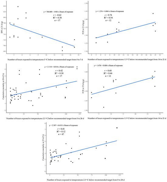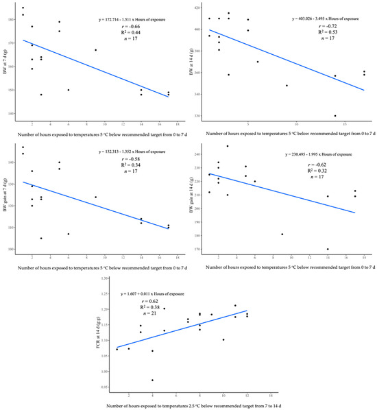 Relationship between the live performance parameters of Ross 308 AP broilers from 7 to 14 d and the hours of exposure to temperatures below the recommended values by Aviagen [38]. n = 80 flocks.