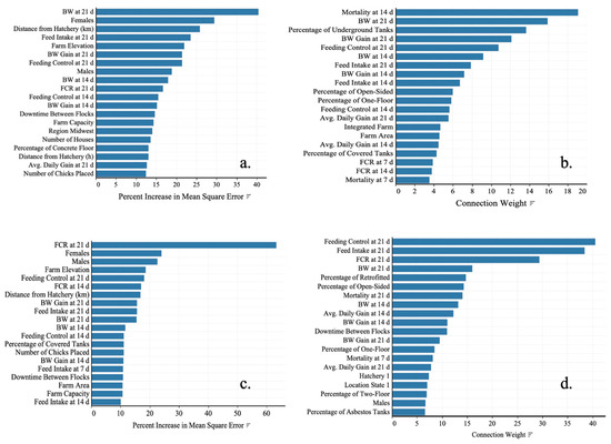 FCR prediction: In MLR, the FCR at 21 d was the most critical variable, with 42.41% of the total response, followed by downtime between flocks with 18.67%, feed intake at 14 d with 17.63%, and percentage of retrofitted houses (infrastructure) with 7.34%. The other predictors in the model contributed less than 4% each. A total of 10 variables were included in this model. In the variable importance analysis from the RF of FCR at 35 d, the FCR at 21 d was the most important variable (63.26%) compared to other predictors, followed by sex (24.07%) and farm elevation (18.59%) (Figure 3c). Like the BW models, BW, BW gain, and FCR at 14 and 21 d were within the 20 most important factors, and distance between farm and hatchery (16.86%) was listed within the ten first ones. The ANN demonstrated that the response strongly depended on the feed intake, FCR, and BW results at 21 d, followed by the percentage of retrofitted and open-sided houses in the farm (Figure 3d). Again, the BW and BW gain at 14 d and the downtime between flocks are essential factors for predicting FCR at 35 d.