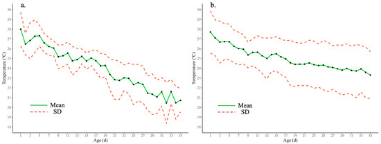 Mean ± SD of house temperature from flocks that presented (a) more than 450 h (53.6% of the time) within the temperatures recommended by Aviagen [38] for chickens between 1 and 35 d and (b) flocks affected by cumulative exposure to temperatures 2.5 °C lower than recommended. These graphics demonstrate the higher variability or wider confidence interval observed in houses (b) with flocks with more cumulative hours below target.