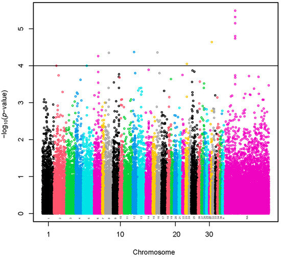 A set of 11 SNPs (−log10(p-values) > 4) was selected using a sample of 960 alpacas (Figure 1 and Table S1). The SNP effects with values preceded by a negative sign (Table S1) indicate that the presence of the less frequent allele could be associated with a decrease in fiber diameter. A total of 18 lncRNA and 69 protein-coding genes harbored these SNPs or were found within a span of 500 kbp from the identified SNPs (Table S2). The GO annotations were not identified. We present the KEGG pathways in Table S3. The KEGG pathways were not associated significantly with the genes.