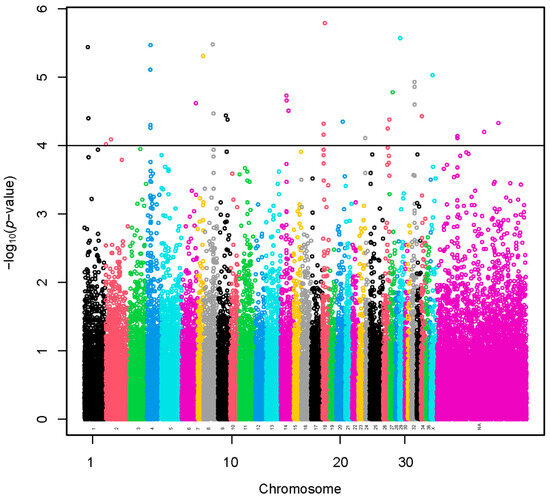 Manhattan plot of a genome-wide association study based on linear model for fiber diameter at second shearing of all the alpacas. The y-axis represents the negative base 10 logarithm of p-value. The x-axis represents the relative position of each SNP across the genome considering the order of scaffolds and chromosomes on VicPac3.1 assembly report.