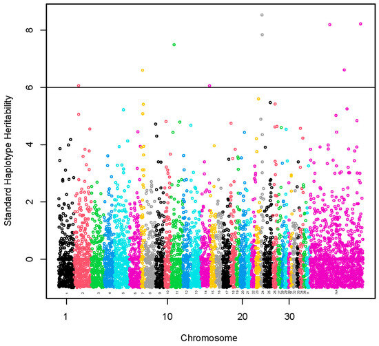 The haplotype and marker analysis allowed us to identify regions based on standardized haplotype heritability >6. Of 27 SNPs located in the identified haplotypes, none had SNP heritability >6; therefore, these regions may not be identified when evaluating only SNP heritability [28].