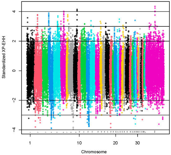 Standardized XP-EHH values greater than 2 SD or lower than −2 SD were used to identify 1954 selection signals (Figure 4). The positive scores indicate selection in the observed population (coarse group), and the negative scores indicate selection in the reference population (fine group) [41].