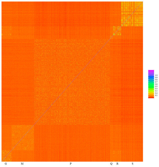 Heat map of genomic relationships among animals based on microarray genotyping of Gacocen (G), Mallkini (M), Pacomarca (P), Quimsachata (Q), Racco (R) and Sogamu (S).