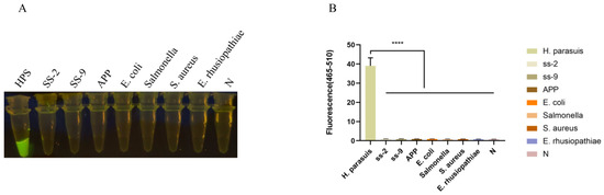 Chicago/Turabian StyleZhang, Kunli, Zeyi Sun, Keda Shi, Dongxia Yang, Zhibiao Bian, Yan Li, Hongchao Gou, Zhiyong Jiang, Nanling Yang, Pinpin Chu, and et al. 2023. "RPA-CRISPR/Cas12a-Based Detection of Haemophilus parasuis" Animals 13, no. 21: 3317. https://doi.org/10.3390/ani13213317