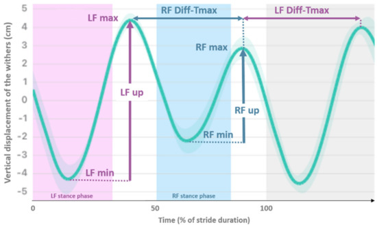 Figure 1. Mean vertical displacement (cm) of the withers plotted against time (expressed as percentage of stride duration) of a horse showing right forelimb (RF) lameness. Asymmetry Indices (AIs) are AI-min = RFmin−LFmin/LFup; AI-max = LFmax−RFmax/LFup; AI-up = LFup−RFup/LFup; and AI-Tmax = LFdiffTmax−RFdiffTmax/LFdiffTmax. (LF—Left Forelimb).