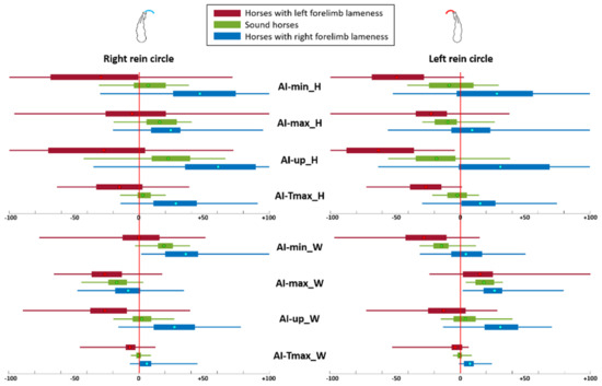 Figure 2. Boxplots of Asymmetry Indices (AIs) in percentage for sound horses and horses with a left forelimb lameness and right forelimb lameness. The dot represents the mean, the two extremities of the box are 25th and 75th percentiles, and extremities of the whiskers represent the minimum and maximum. A negative value reflects reduced movement or duration during the left limb stance, and positive value reflects reduced movement or duration during the right limb stance.