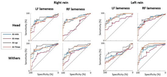 Figure 3. Receiver Operating Characteristic (ROC) curves discriminating horses with a constant Left Forelimb (LF) lameness from sound horses; and discriminating horses with a constant Right Forelimb (RF) lameness from sound horses, plotted for both reins on a circle. Tested Asymmetry Indices were AI-min (blue), AI-max (red), AI-up (grey) and AI-Tmax (orange). The highest specificity and sensitivity point of each curve is represented by a circle (top-left method). The black line is the hypothesized ROC curve with discriminative power only due to chance.