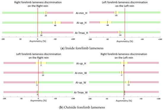 Figure 4. Thresholds (black line) of Asymmetry Indices (AIs) (in percentage of asymmetry) for lameness discrimination when the lame limb was on the inside of the circle (a) and when the lame limb was on the outside of the circle (b). Only the AIs with the sum of sensitivity and specificity over 150% for both right and left reins are plotted. Three ranges of values are represented: yellow for 95% confidence interval (95% CI) around the threshold, green for values below the 95% CI (“sound” horses) and red for values beyond the 95% CI (“lame” horses).