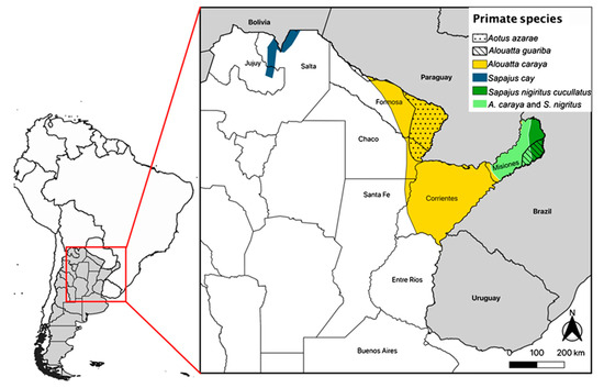 - Agostini, I.; Velazco, S.J.E.; Insaurralde, J.A.; Pavé, R.; Holzmann, I.; Fernández-Duque, E.; Tujague, M.P.; Peker, S.; Kowalewski, M.M.; Di Bitetti, M.S. Prioritizing Areas for Primate Conservation in Argentina. Diversity 2022, 14, 982. [Google Scholar] [CrossRef]
