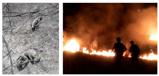 Images of the EBCO field site after the anthropogenically induced fires of August–October 2020 show two calcined howler monkeys (left), and firefighters controlling an active line of fire (right). Photo credit: Marita Romero and Adriana Vallejos.