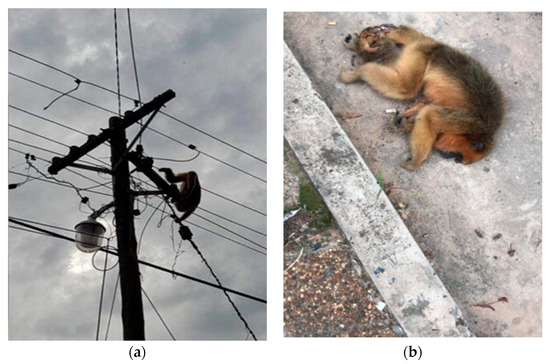 Lethal electrocutions of howler monkeys (A. caraya) in (a) the city of Posadas—Misiones province and (b) the city of Formosa—Formosa province. Photo credit: (a) Misiones Online (www.misionesonline.net/2022/07/14/mono-electrocutado-en-posadas, accessed on 20 October 2023); (b) La Mañana Online (www.xn--lamaanaonline-lkb.com.ar/noticia/48669/un-mono-caray-provoc-un-cortocircuito-en-el-tendido-elctrico-y-dej-sin-luz-al-centro-de-la-ciudad, accessed on 16 September 2023).