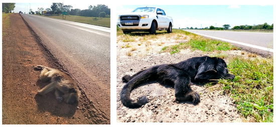 The Red Argentina de Monitoreo de Fauna Atropellada (RAMFA) systematizes the data collected by citizens through a cellphone app. As of April 2023, there were 13 recorded cases of deadly roadkills (10 A. caraya and 3 S. nigritus) in the provinces of Chaco, Corrientes, and Misiones (www.fauna-atropellada.org.ar, accessed on 20 October 2023). While the number of primate deaths recorded is low compared to the overall number of wildlife roadkills (5846 cases), the initiative has the potential to be useful for future scientific analysis and to be used by Argentinean conservation practitioners and policymakers.