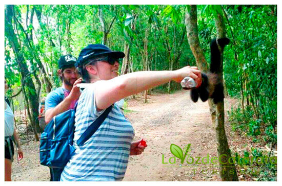 Food provisioning is a common problem in areas where primates and humans co-occur (e.g., urban areas), but mostly in, or near, tourist areas. Several studies have assessed the impact of tourism or provisioning on primates worldwide [128,129,130], showing that sociocultural elements (e.g., age, gender, education, and religious beliefs) explain why humans engage in these behaviors at tourist sites, such as [128,131]. Overall, humans feel compelled to give primates food because of the desire to observe them closely and concerns over decreasing food resources for wildlife.