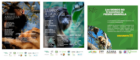Another initiative is to evaluate and reduce the impacts of yellow fever on the population of brown howler monkeys. The brown howler, A. guariba, was listed both in 2018 and 2022 as one of the 25 most threatened primate species worldwide [149]. It is the species most affected by yellow fever. There are only six confirmed localities for the species in the province of Misiones, and a population estimate of 20–50 adult individuals remaining in the country. Since the situation is so critical, researchers recently conducted a workshop to develop the most appropriate management plan for the species [150]. The agreed plan includes informed debates about the risks and benefits of reintroduction, rescue, population reinforcement, and ex-situ programs. Some of the measures also aim to recover the value that the brown howler monkey has for local communities: howlers are seed dispersers [151], sentinels of diseases like yellow fever (i.e., they show high mortality when infected by the virus, which allows for the establishment of control and prevention measures early on when death monkeys are found), and their howls are characteristic of the forests of Misiones. Reinforcing the value of primate species for local communities has been identified as a powerful mechanism to mitigate the consequences and negative effects of human–primate conflict [152].