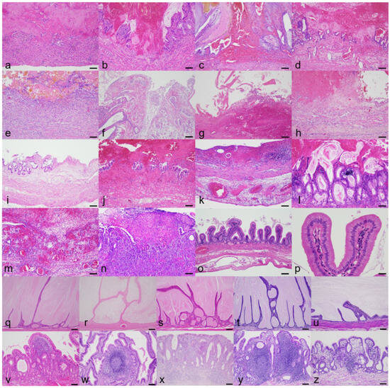 Overview of the representative histopathology of each disease cohort and the clinical control dog. Hematoxylin and eosin (H&E). (a–n) Gallbladder erosion/ulcer is accompanied by hemorrhage: (a) gallbladder erosion/ulcer case #1 (GU1); (b) GU2; (c) GU3; (d) GU4; (e) GU5; (f) GU6; (g) GU7; (h) GU8; (i) GU9; (j) GU10; (k) GU11; (l) GU12; (m) GU13; (n) GU14. (o) There are no significant lesions in the gallbladder of the clinical control dog. (p) Higher magnification of (o). (q–u) Gallbladder mucocele is characterized by abundant thick mucus accumulation in the lumen: (q) gallbladder mucocele case #1 (GM1); (r) GM2; (s) GM3; (t) GM4; (u) GM5. (v–z) Chronic cholecystitis manifests significant lymphoplasmacytic infiltrates in the lamina propria: (v) chronic cholecystitis case #1 (CC1); (w) CC2; (x) CC3; (y) CC4; (z) CC5. Bar = 100 µm except for (p), whose bar is 25 µm.