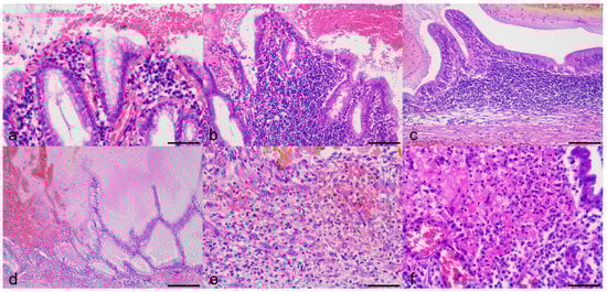 All GU cases had mucosal erosion and/or ulceration of various geographical degree (focal to extensive) with hemorrhage. Gross appearance of the lesions is shown in Supplementary Figure S1. Histologic lesions are depicted in Figure 1a–n. Gallbladder mucosal epithelial cells at the rim of erosion/ulceration generally showed no significant morphological change (Figure 2a) but with rare pyknosis. Histological characteristics other than erosion/ulceration markedly varied among 14 cases. Histological gallbladder contents of the dogs of the GU cohort included blood (n = 13; 92.8%), mucus (n = 9; 64.2%), bile (n = 5; 35.7%), suppurative exudate (n = 3; 21.4%), and fibrin (n = 2; 14.2%). Twelve out of fourteen cases of the GU cohort had infiltration of lymphocytes and plasma cells in the lamina propria (chronic cholecystitis), with ten cases (71.4%) being judged severe (Figure 2b,c) and the remaining two (14.2%) as mild degree. Two cases had mucocele with or without concurrent chronic cholecystitis (Figure 2d). Three cases (GU5, 13, and 14) of the twelve GU cases with chronic cholecystitis had severe infiltration of neutrophils with hemorrhage and fibrin exudation confined to the ulcerated mucosa and submucosa (Figure 2e,f). The average gallbladder wall total thickness (GWTT) in GU patients was 1685 µm (range 840–3800 µm), i.e., approximately 3 times thicker than that of the clinical control dog (550 µm) due to fibrosis, smooth muscle hyperplasia/hypertrophy, interstitial edema, and mixed inflammatory infiltrates (Figure 1o,p). The average GWTT of CC and GM patients were 1430.4 µm (range 912–1780 µm) and 1574.2 µm (range 481–2710 µm), respectively. The GM cohort was histologically characterized by a luminal distention by abundant semi-solid gelatinous contents and mucosal hyperplasia (Figure 1q–u), and they tended to have concurrent minimal/mild cholecystitis and variably increased GWTT (up to 5 times thicker than the normal canine gallbladders). The CC cohort was characterized by severe cholecystitis and variably increased GWTT (2 to 3 times thicker than the normal canine gallbladders) (Figure 1v–z). No fibrin thrombi were detected by PTAH in any of 24 samples.