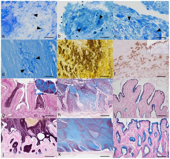 The results are summarized in Table 2. Bacteria were demonstrated by Giemsa and Warthin–Starry (WS) stains in 8/14 (57.1%) GU, 5/5 (100%) GM, and 0/5 (0%) CC cases (Figure 3a–e). The gallbladder of the clinical control dog did not reveal bacteria by either staining method. The morphology of bacteria varied from cocci to coccobacilli to rods. Bacterial rods were well delineated by the WS stain, but bacteria of typical spirochete morphology were not detected in any samples stained with WS. Rod-shaped bacteria of GM4 (1/24, 4.1%) were immunopositive to the anti-Helicobacter antibody (Figure 3f). Using the HID-AB pH 2.5 method, the types of mucus produced by the gallbladder mucosal epithelial cells were found to vary markedly among individual cases (Figure 3g–l). In the GU group, there were five cases of mixed pattern, five cases of a sulfomucin-dominant pattern, two cases of two-tone mucin production (sulfomucin by mucosal surface and sialomucin by crypts), one case of a sialomucin-dominant pattern, and one case of unstained mucus. In the GM group, two cases were of a sulfomucin-dominant pattern, two cases were mixed pattern, and there was one sialomucin-dominant pattern. In the CC group, three cases showed a mixed pattern while two cases were a sulfomucin-dominant pattern.