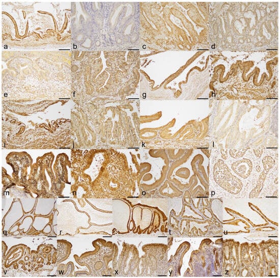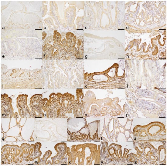 Results of anti-COX-1 immunohistochemistry: (a) gallbladder ulcer case #1 (GU1), negative; (b) GU2, negative; (c) GU3, negative; (d) GU4, negative; (e) GU5, negative; (f) GU6, positive; (g) GU7, negative; (h) GU8, positive; (i) GU9, negative; (j) GU10, negative; (k) GU11, positive; (l) GU12, negative; (m) GU13, positive; (n) GU14, positive; (o) gallbladder of the clinical control dog, negative; (p) tissue of canine small intestine as a positive control for COX-1 IHC, positive; (q) gallbladder mucocele case #1 (GM1), positive; (r) GM2, negative; (s) GM3, positive; (t) GM4, positive; (u) GM5, positive; (v) chronic cholecystitis case #1 (CC1), positive; (w) CC2, positive; (x) CC3, positive; (y) CC4, positive; (z) CC5, positive. Bar = 100 µm.