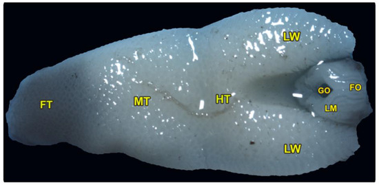 Gross morphology of the tongue of Heremites vittatus, showing the foretongue (FT), midtongue (MT), hindtongue (HT), the lingual wings (LW), the laryngeal mound (LM), the median glottic opening (GO), and laryngeal folds (FO).