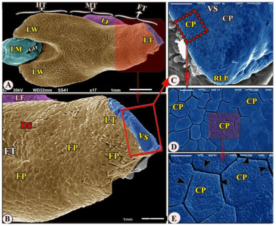 Scanning electron microscopic image (views (A–E)) of the Heremites vittatus tongue showing the foretongue (FT) with its lingual part (LT) with its anterior round tip (RLP), midtongue (MT) with lingual frenulum (LF), and hindtongue (HT). The dorsal surface (DS) possessed papillae filiformes (FP). The ventral surface (VS) possessed papillae conicae (CP) that separated narrow spaces (black arrowheads). The lingual wings (LW), the laryngeal mound (LM), the median glottic opening (GO) were clear.