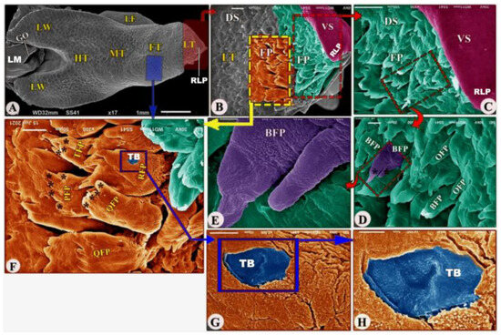 Scanning electron microscopic image (views (A–H)) of the Heremites vittatus tongue showing the foretongue (FT) with its lingual part (LT) with its anterior round tip (RLP), midtongue (MT) with lingual frenulum (LF), and hindtongue (HT) with its lingual wings (LW). The ventral (VS) and dorsal (DS) surfaces possessed filiform papillae (FP), bifid filiform papillae (BFP), pointed filiform papillae (OFP), trifid filiform papillae (TFP), quadrifid filiform papillae (QFP), pentafid filiform papillae (PFP) with processes (black star), triangular filiform papillae (RFP), and taste buds (TB). The laryngeal mound (LM) with the median glottic opening (GO) and laryngeal folds (FO).
