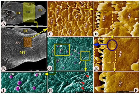 Scanning electron microscopic image (views (A–I) of the Heremites vittatus tongue showing the foretongue (FT), midtongue (MT), lingual frenulum (LF), and hindtongue (HT) with its wings (LW). The dorsal surface of the midtongue possessed overlapped scale-like serrated filiform papillae (SFP) with a serrated apex (black arrowheads). With a high magnification of the papillary surface, there were taste buds (TB), microridges (Mr), and anterior salivary gland openings (red arrowheads).