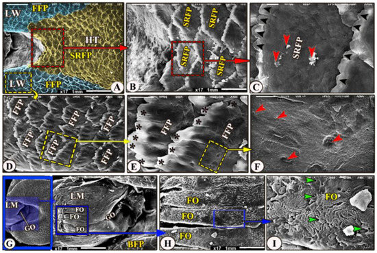 Scanning electron microscopic image of the Heremites vittatus tongue. (Views (A–F) show the dorsal surface of the hindtongue (HT) that carried scale-like board serrated papillae (SRFP) with a serrated apex (black arrowheads) in the median part, whereas the wings (LW) had finger-like projected papillae (FFP) with processes (black stars). The high magnification of the papillary surface showed numerous posterior salivary gland openings (red arrowheads). (Views (G–I)) showing the laryngeal mound (LM) and median glottic opening. (GO), with high magnification, its dorsal surface possessed 18 longitudinal laryngeal folds (FO) and numerous small openings of the laryngeal salivary glands (green arrowheads).