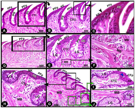 Micrograph image (views (A–J)) of the dorsal surface of the foretongue (views (A–C)), midtongue (views (D–F)), and hindtongue (views (H–J)) of the Heremites vittatus tongue. The pointed filiform papillae (PFP) and conical papillae (CFP), interpapillary space (IPS), connective tissue core (CTC), muscle bundles (MB), keratinized (KE) or non-keratinized (NK) dorsal squamous epithelium (DE), keratinized layer (black arrowhead), taste buds (blue arrowhead), and lingual glands (LG). H&E stain.