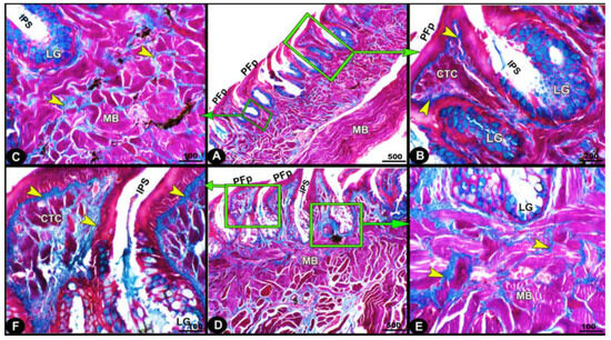 Micrograph image (views (A–F)) of the Heremites vittatus tongue showing the pointed filiform papillae (PFP), interpapillary space (IPS), connective tissue core (CTC), muscle bundles (MB), collagen fibers (yellow arrowheads) that were intertwined and filled the core of each papilla, and glands (LG). Masson’s trichrome stain.